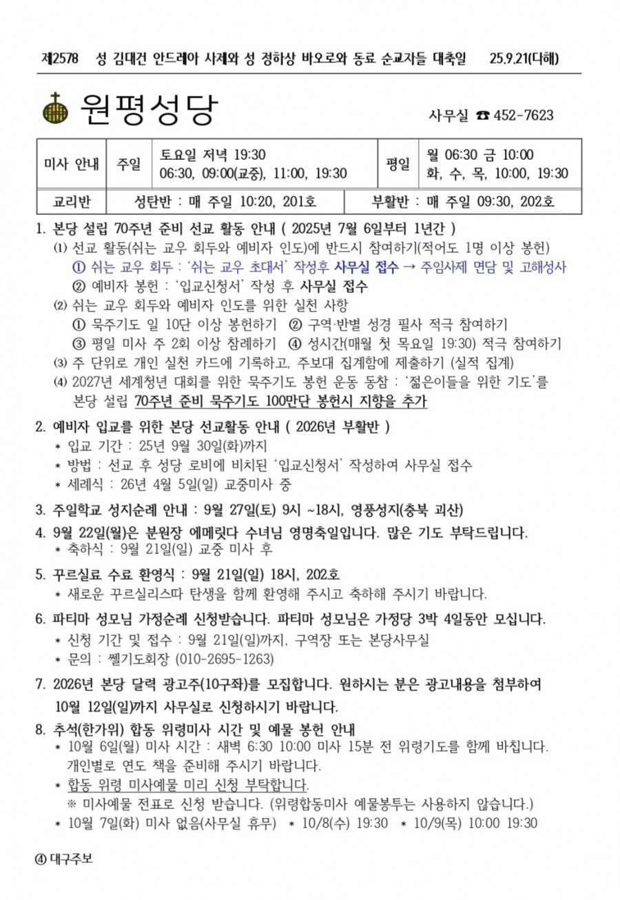 2025년 09월21일 (순교자 대축일) 원평주보 > 본당주보