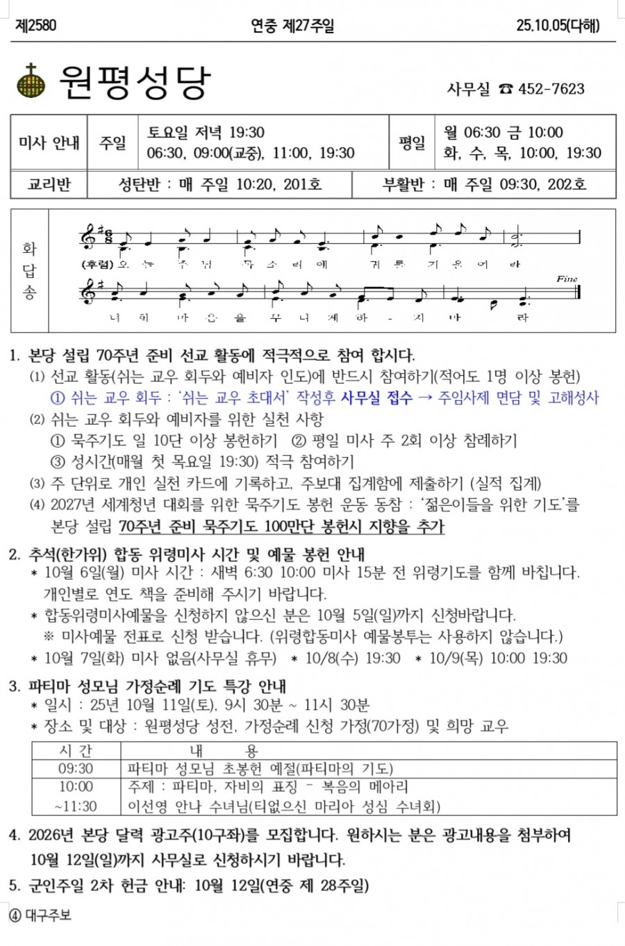 2025년 10월05일 (연중 제 27 주일) 원평주보