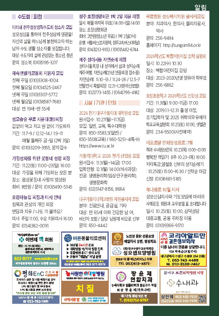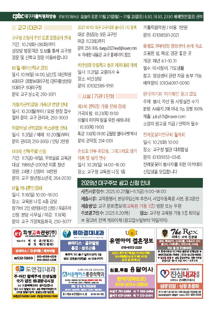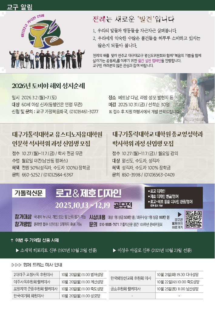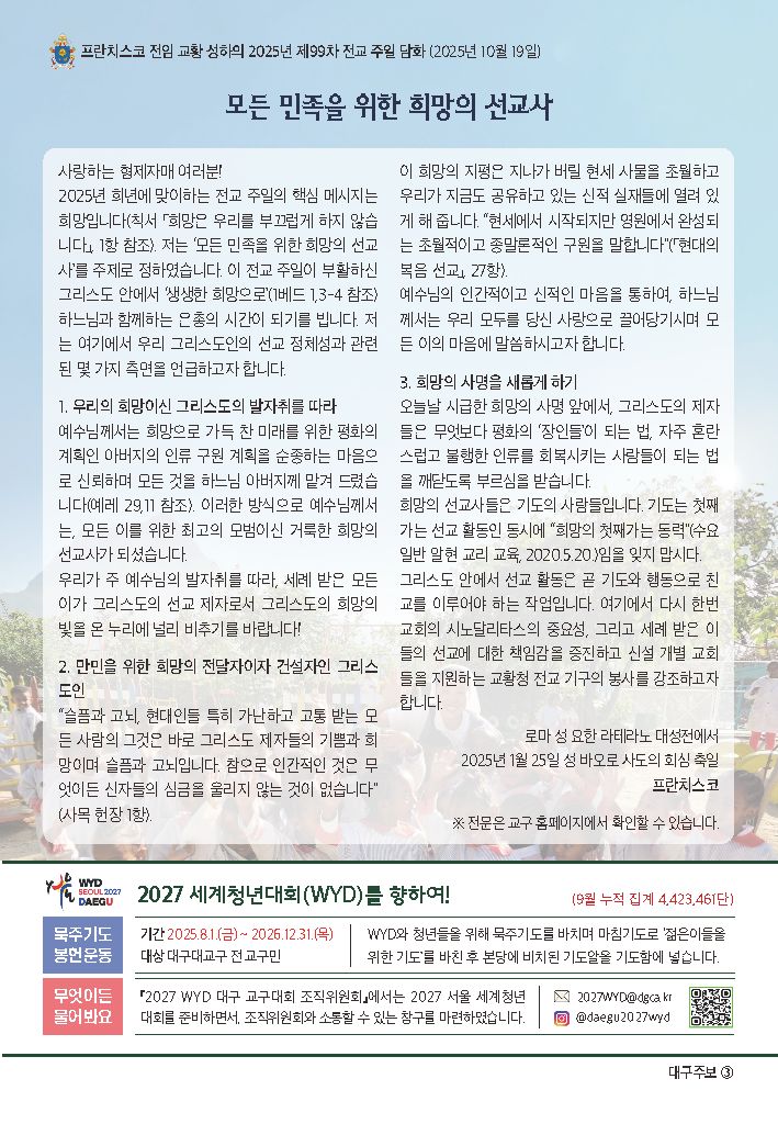 2025년 10월19일 (연중 제 29 주일, 전교주일, 민족들의 복음화를 위한 미사) 대구주보 페이지 정보 본문 2025년 10월19일 (연중 제 29 주일, 전교주일, 민족들의 복음화를 위한 미사) 대구주보 목록