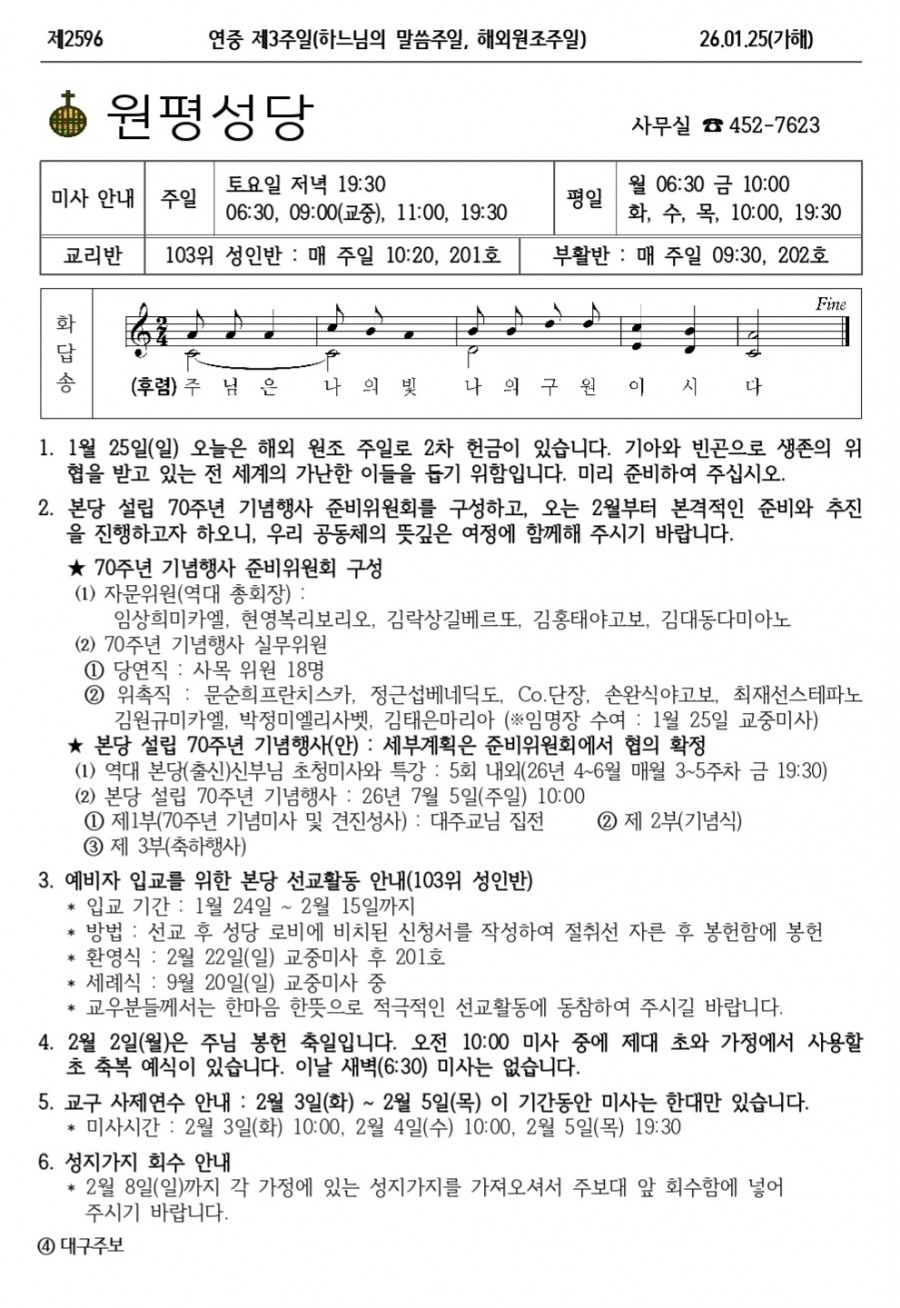 2026년 01월25일 (연중 제 3 주일, 하느님의 말씀 주일, 해외원조 주일) 원평주보 페이지 정보 본문 2026년 01월25일 (연중 제 3 주일, 하느님의 말씀 주일, 해외원조 주일) 원평주보 목록