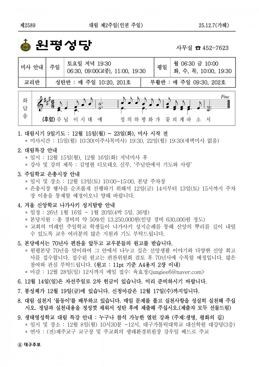 2025년 12월07일 (대림 제 2 주일, 인권주일, 사회 교리 주간) 원평주보 페이지 정보 본문 2025년 12월07일 (대림 제 2 주일, 인권주일, 사회 교리 주간) 원평주보 목록